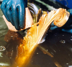 The mercury gilt and steel balustrade had been constructed by Allard and Sons. Over time this gold plate had become discolored and required conservation to prevent its eventual loss. In several places over aggressive restoration had all but removed the thin layer of gold, exposing the deeper colored bronze. We...