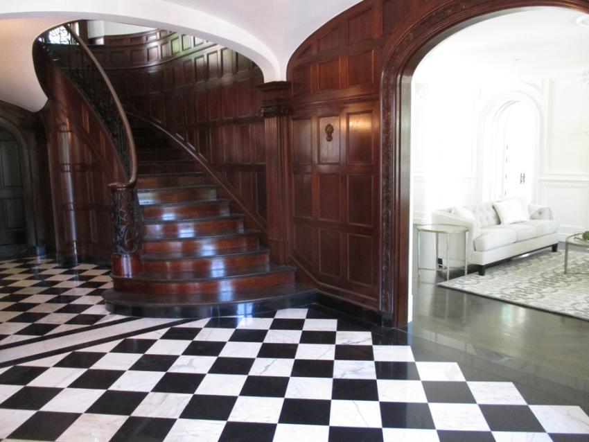 The mahogany paneled entrance hall of this early twentieth century colonial revival home was undergoing a major renovation. The panel system contained damaged and faded areas, and new mahogany doors and moldings were being added. The original windows were being replaced with new pine casement sash. Our assignment was to blend together the faded, new, and discordant woods into a unified monochromatic finish.