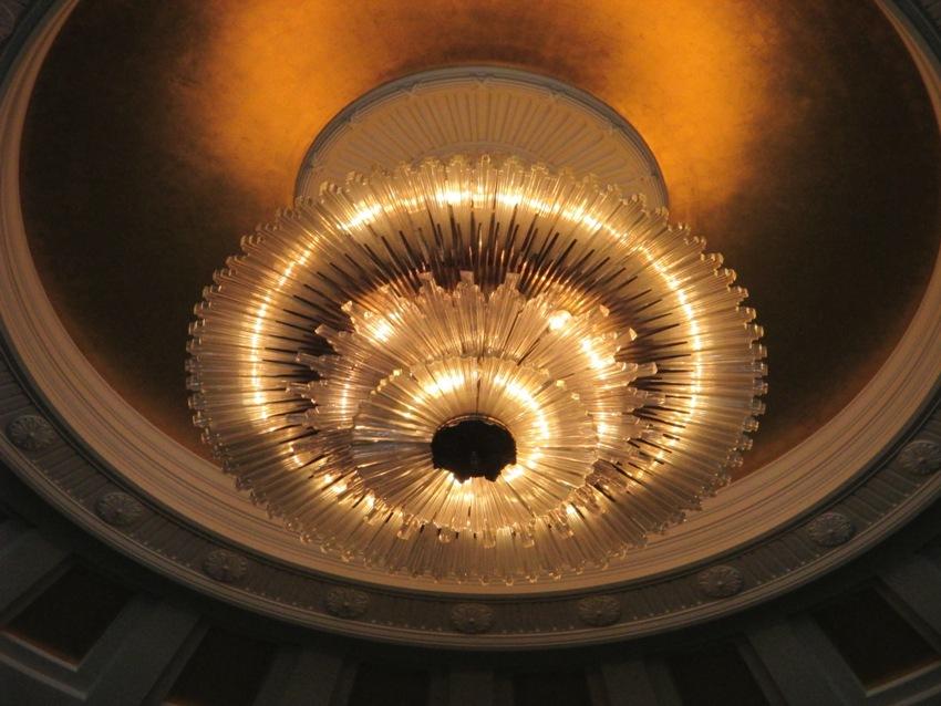 The large crystal and brass chandelier had adorned the entrance lobby at Mass Mutual since the 1920s. This unique chandelier was constructed using three iron discs with holes drilled to secure 172 large clear glass sunbursts. A very heavy fixture, weighing close to five hundred pounds with its crystals, this chandelier restoration and conservation project required their removal first, followed by disassembly of the iron sections. The crystals had to be individually wrapped and carefully lowered to the floor. Iron units were lowered in sections for disassembly at the shop. Consisting of Three tiers, the fixture was cleaned, and more importantly, rewired. It was very important to secure the wires, since the chandelier was mounted 65 feet from the floor.