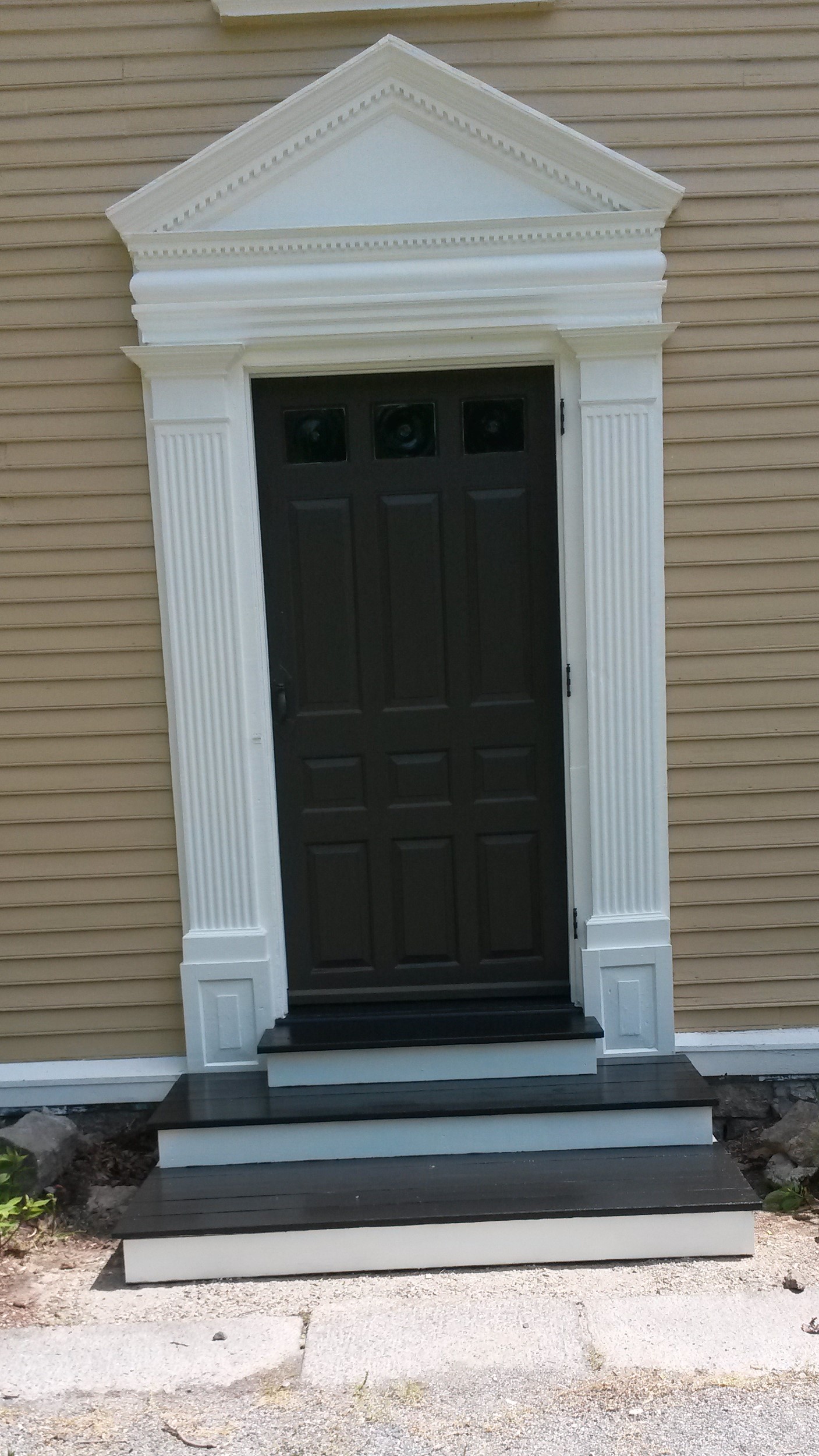 For this historic wood finish restoration project, we also conducted an investigation of the west entrance door, which had been rebuilt several times in the history of the house. At some point in the 1970s, granite blocks were installed, concealing the lower part of the wood pilasters that flanked the door. The blocks were moved aside and the lower panels removed for conservation. Since there was photographic proof of a different entrance structure, we carefully removed part of the existing pediment, discovering that the entire substructure dated from the 1970s. We were able to obtain some indication of the original size for the doorway by removing several clapboards to determine where the original interior boarding stopped. From this, we were able to determine that the original entrance was considerably wider than the current one, and likely contained side lights. Further investigation and archaeological investigation will be necessary to determine the accuracy of this theory.
