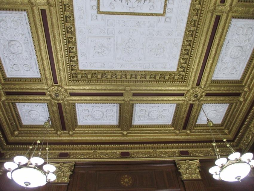 As part of a renovation of this Federal courtroom, we were asked to perform gilt and decorative plaster restoration for the ceiling and niches. We started work on the ceiling. One of the challenges was to match the gold paint that had been used during the last renovation. With some experimentation, we were able to match the color and purchase the amount necessary for our work. The conservation of the decorative plaster niches was challenging because they were thin and cast in burlap and not very stable. The final task was to polish the brass roundels on the entrance doors. We created a template to protect the leather, and using a brass brush, polished the irregular surface. Lastly, an anti-corrosive coating was applied to the restored metal surfaces.