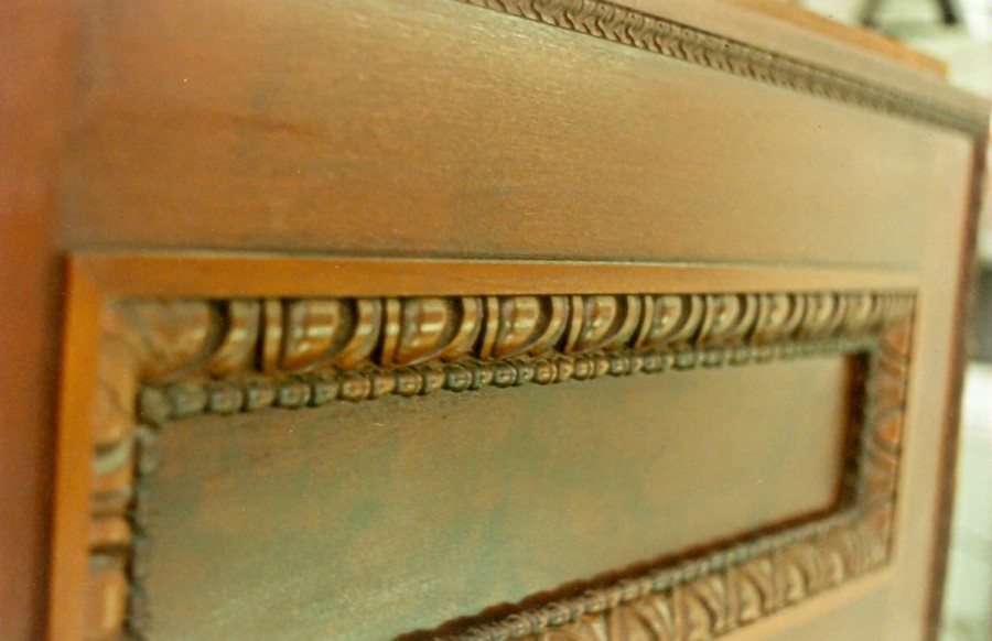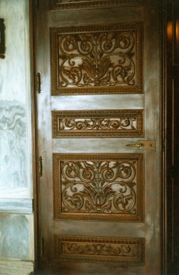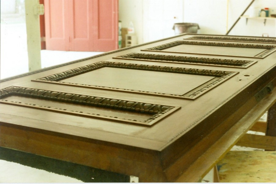 The finish on the large, heavy mahogany doors connecting the first floor rooms of the Breakers had become crazed and dull and needed conservation after over a hundred years of use. Using a hydraulic table, each door was carefully removed from its hinges and transported to the shop. Since the doors had a thick finish, it was possible to remove the crazing and resstore the doors without going through the finish. After each surface had become smooth, they were cleaned, then polished and given coats of brown wax.