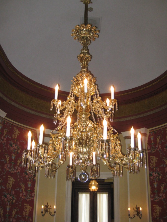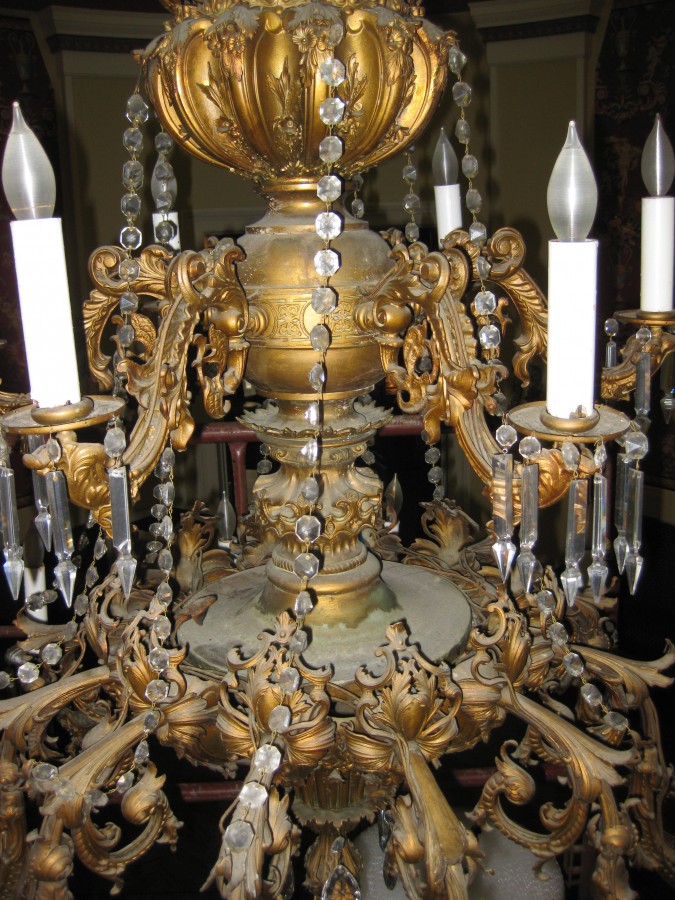 This project, undertaken for the Erie Club, involved the conservation of two chandeliers/gasoliers fabricated by Archer and Warner of Philadelphia during the last quarter of the 19th century. While one of the fixtures was conserved in situ, the second larger chandelier was removed for conservation off site. Over the years, much of the wiring which had been added in the early part of the 20th century had degraded and the original gilt bronze surface had been painted with gold paint. After dismantling the chandelier, the paint was carefully removed from each component and the gilt surface was gently clean through immersion in non-ionic detergent. Upon completion the entire fixture was rewired and reassembled on site. As part of the project, Blackburn Conservation also cleaned, rewired and re-hung the chandelier's crystals.