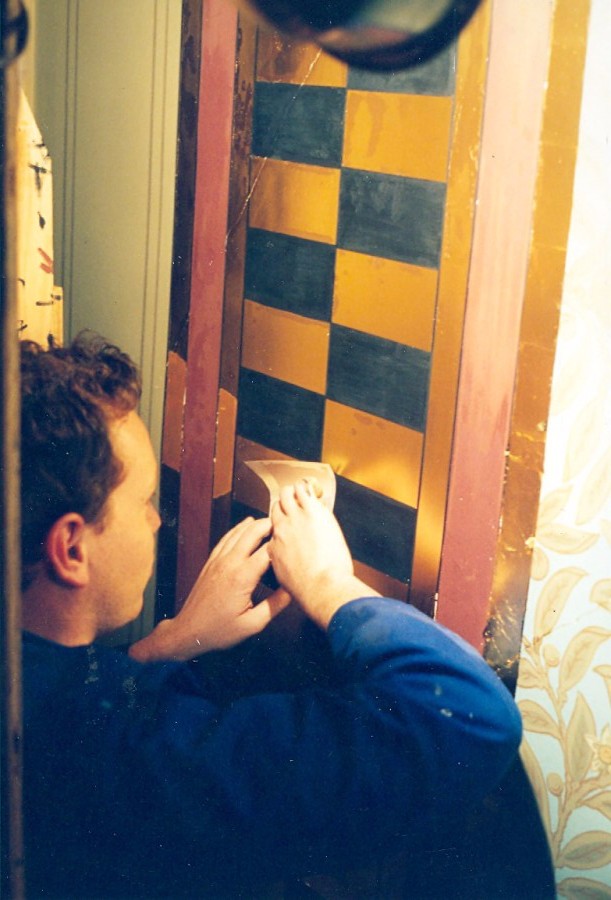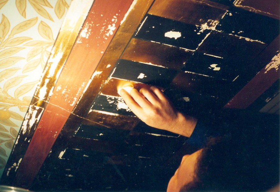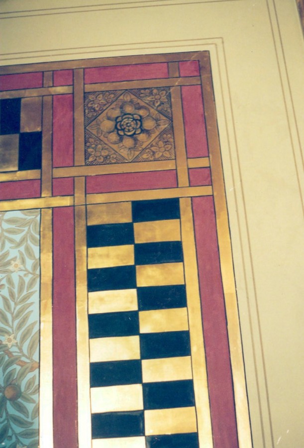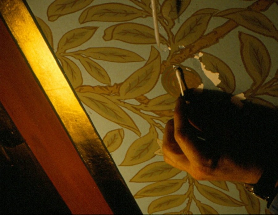 The ceiling in the Wetmore Bedroom dates to the period of re-decoration under William Morris Hunt. Over the years a combination of plaster and paint adhesion problems created small but noticeable areas of loose and missing paint and gold leaf. Due in large part to their size and thickness, the loose paint was successfully consolidated and re-attached using rabbit skin glue. Areas of loss were cleaned, conserved and in painted with matching paints, while missing gold leaf was sized and re-applied. This approach was minimally invasive, while restoring the original look of the decorative program.