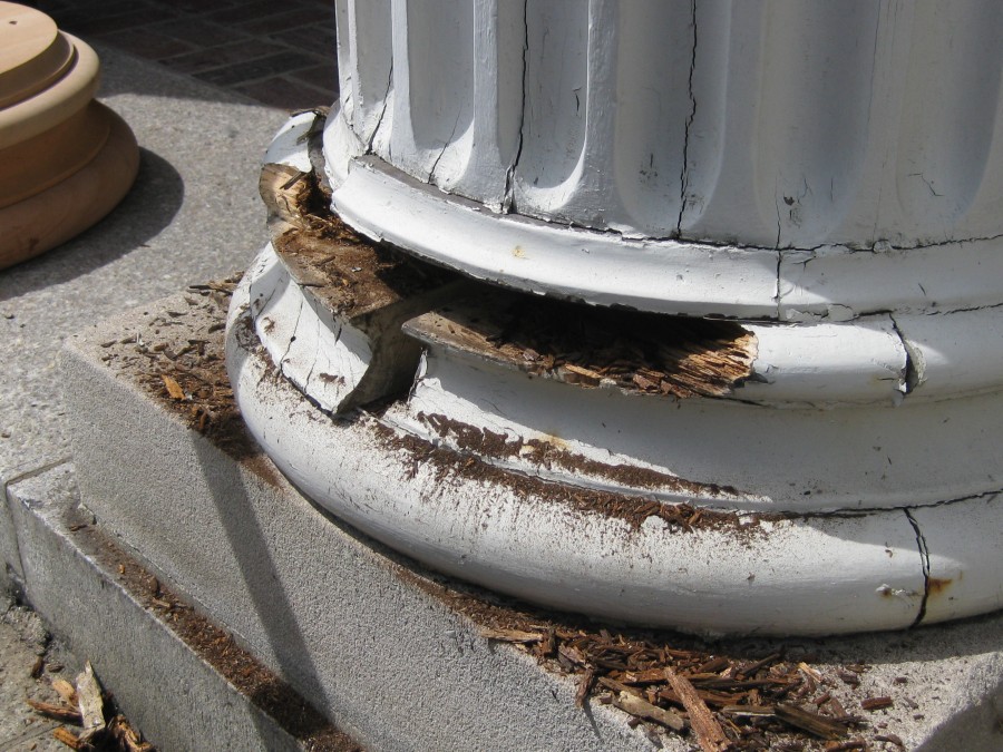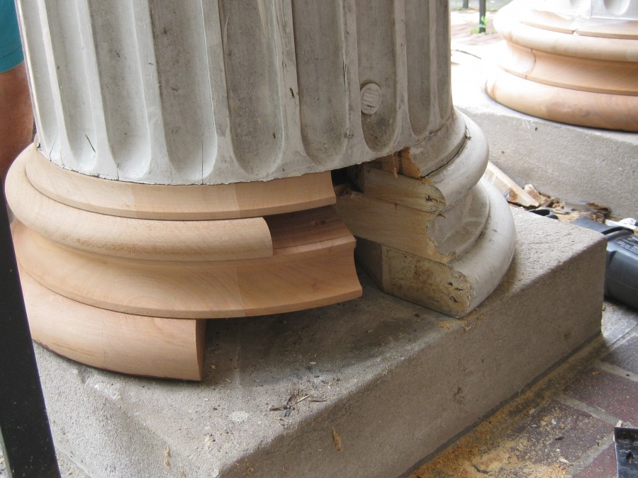 The columns, which form the entrance to the main branch of the Concord Library had considerable rot on their wooden base moldings that rested on stone base blocks. The challenge was to replace the moldings without removing the columns We turned out new bases, divided into four sections and split in half. We cut out and removed half of the rotted section and slid in half of the replacement section. We then removed the second half and installed the rest of the new molding. While the original moldings were made of pine we replaced these moldings with mahogany. Once installed the entire column was painted, making our repair invisible.