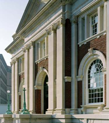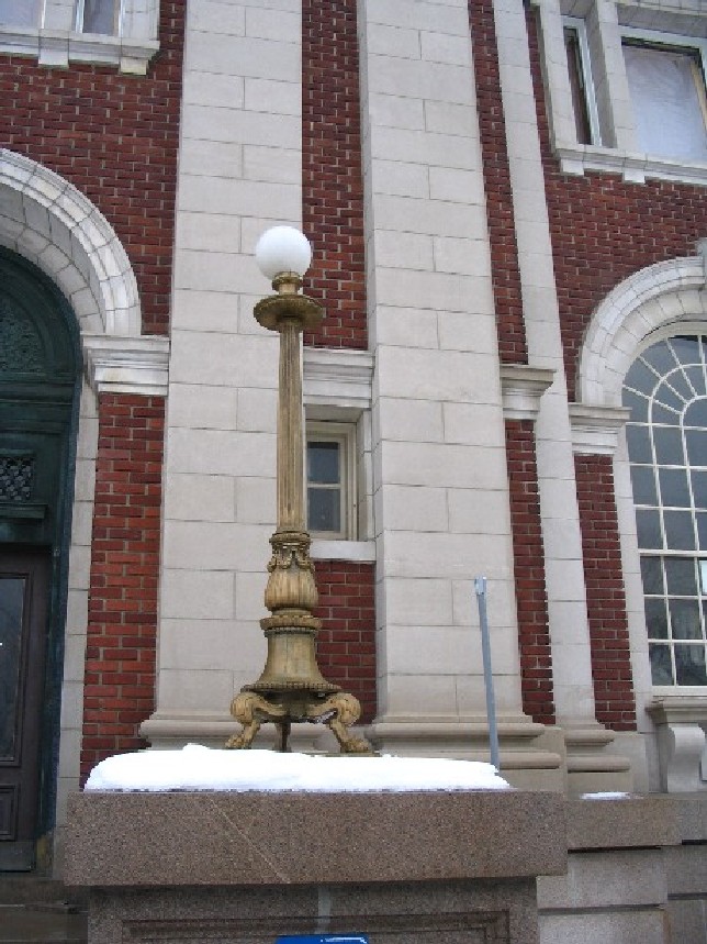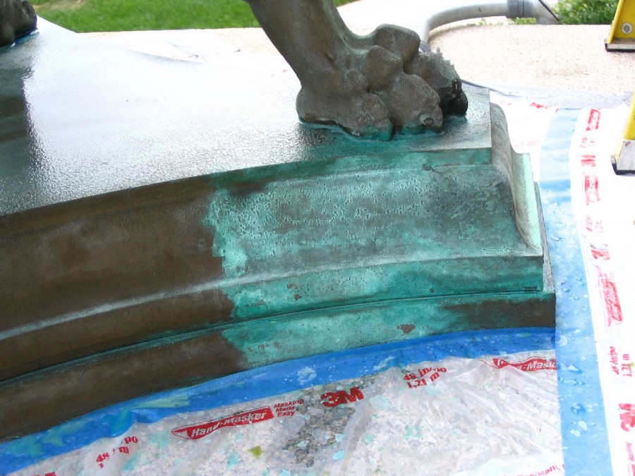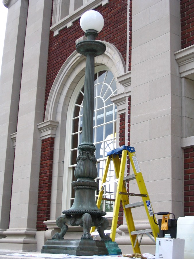 During the renovation of the Hartford Appeals Court building two exterior torchieres were excessively cleaned and all natural green patina removed. After careful neutralization of the surface, we applied the patination chemicals necessary to restore the green patina to these two lighting fixtures. This process returned the original appearance to this important ornamental metalwork.
