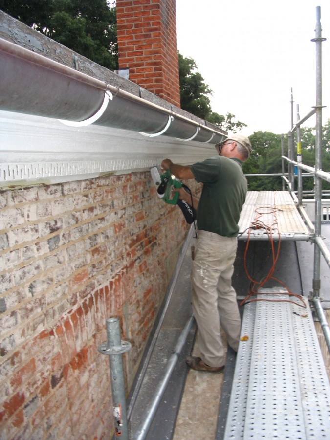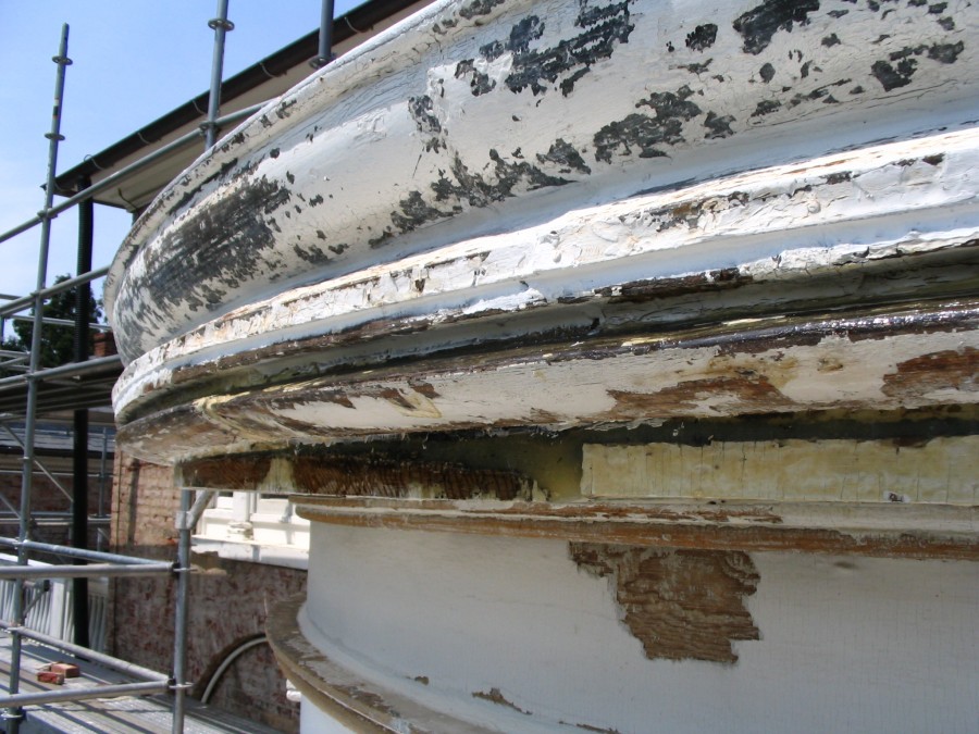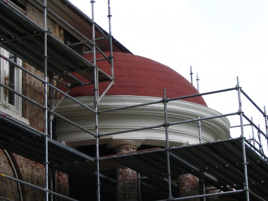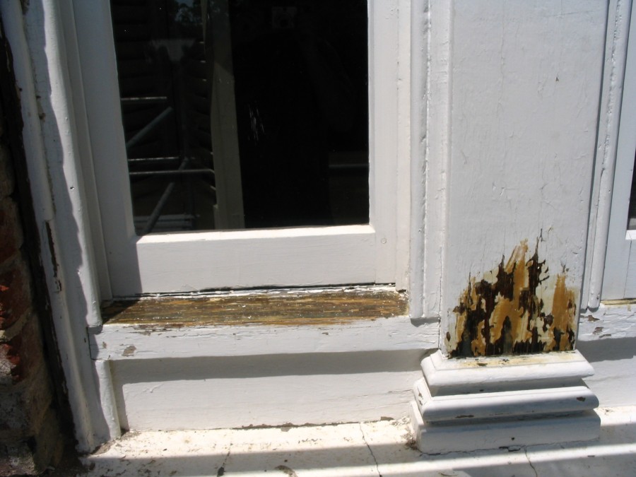 During the replacement of the stucco at Tudor Place, we were called on to perform architectural conservation services on the facade's exterior wood trim and mouldings, window casings and Temple Portico, which had become rotted and damaged over the years due to weather exposure. After all failed paint had been removed, rotted areas were conserved with epoxy consolidation. Care was taken to inspect all flashing systems and gutters to insure that they were not allowing water to penetrate the walls or flow on to the trim boards. Once the repairs and inspections were completed, all exposed wood surfaces were given a coat of oil based primer and two coats of acrylic latex paint. As seen above, Tudor Place - south elevation.