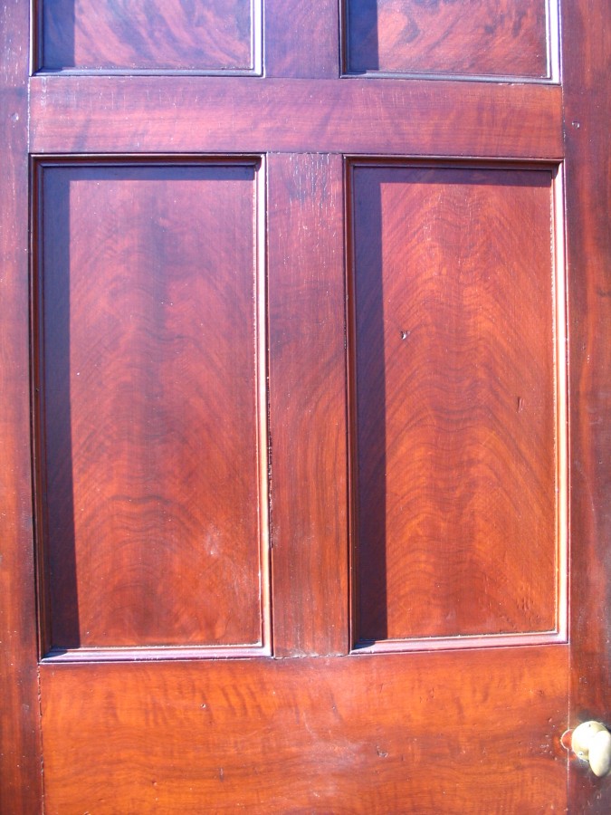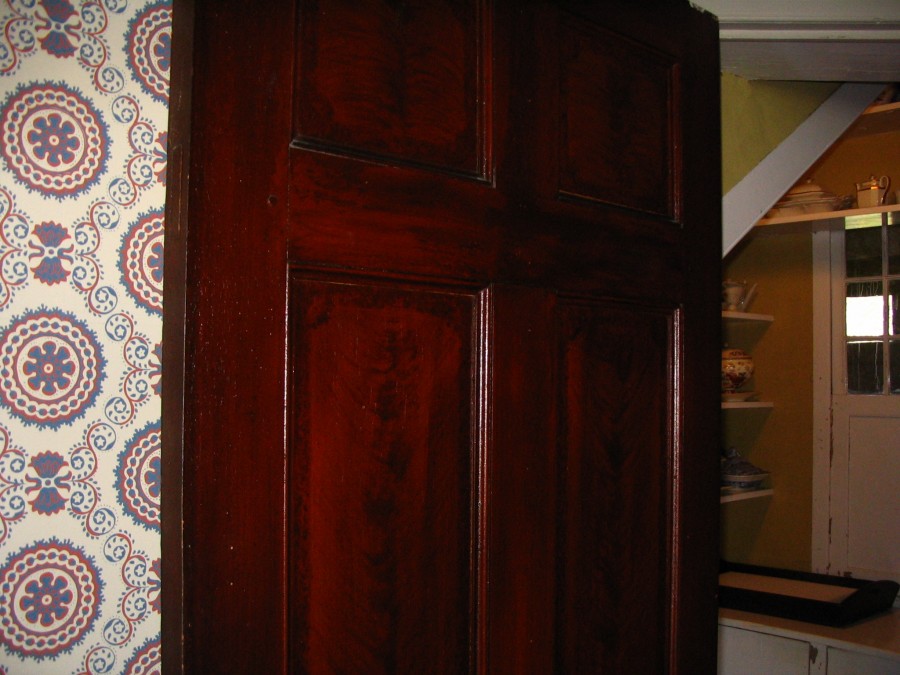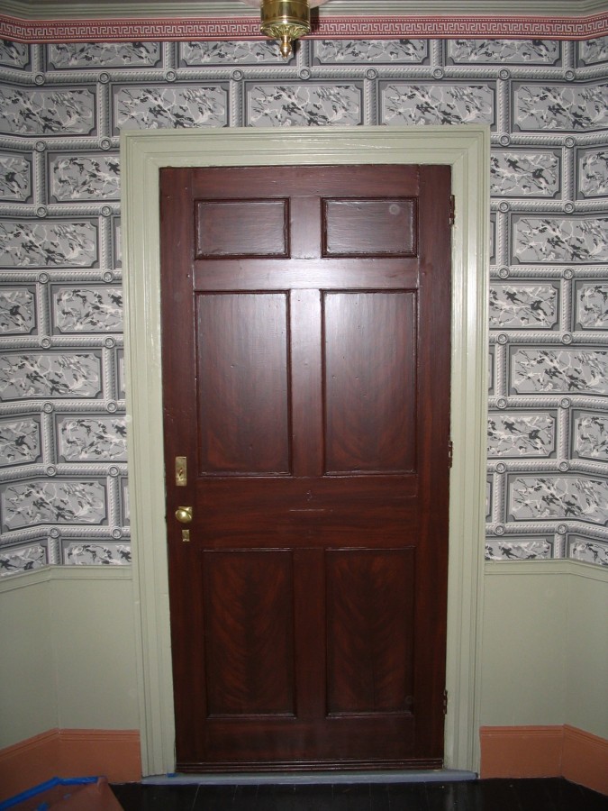 As part of the re-interpretation of the entrance hall of Hedge House, the headquarters of the Plymouth Antiquarian Society in Plymouth MA, finish analysis revealed that the two doors in this space were originally faux wood grained. While graining survived on the opposite side of one of the doors, it was of a later period. An earlier graining sample survived in an adjoining room.