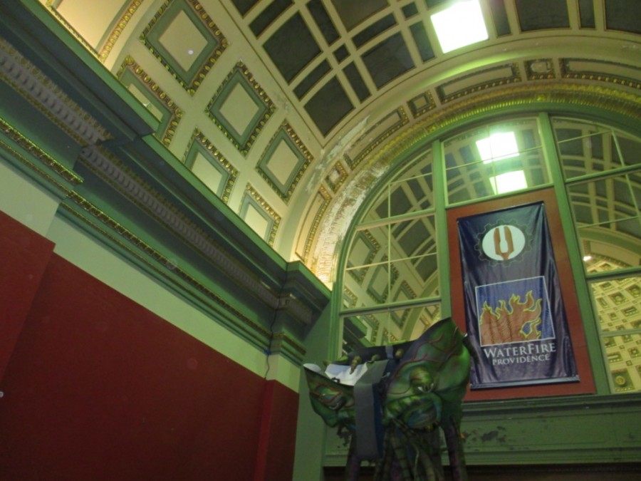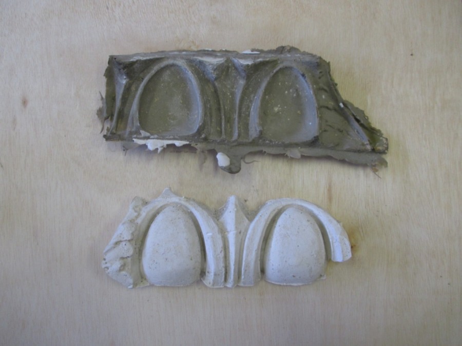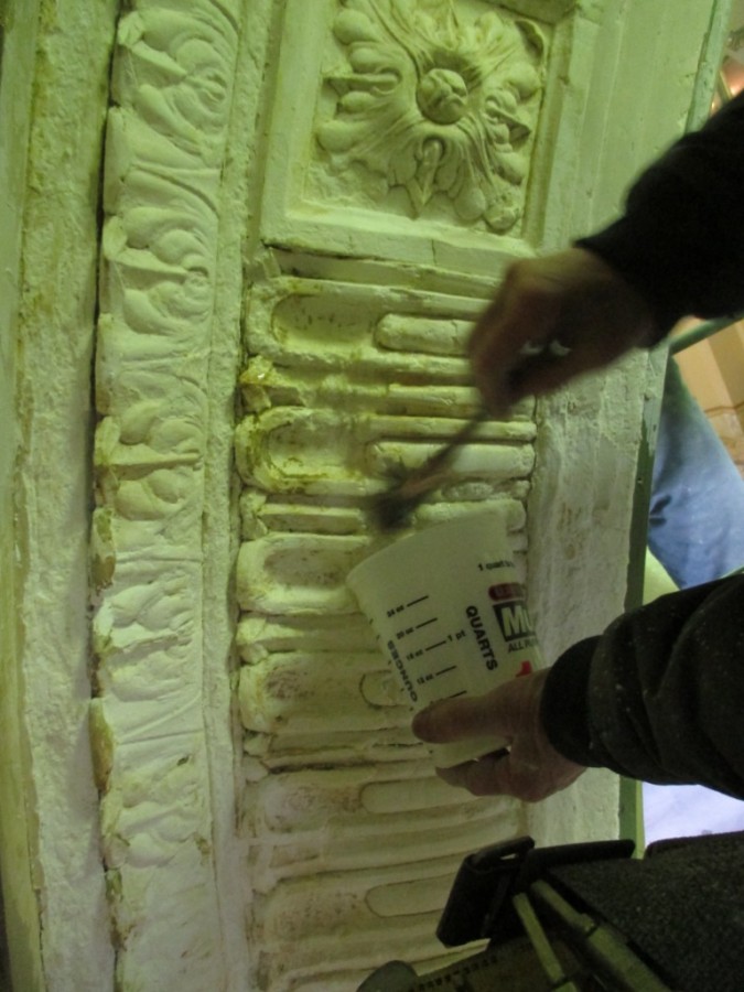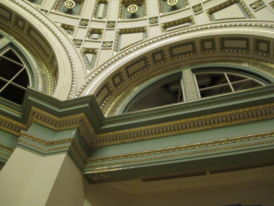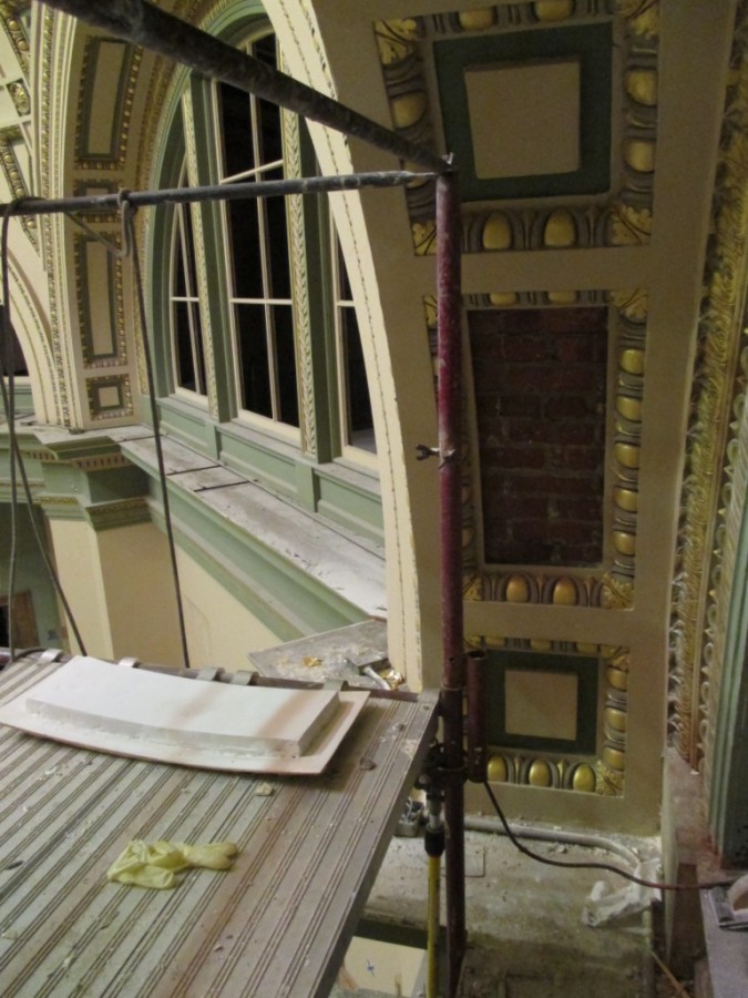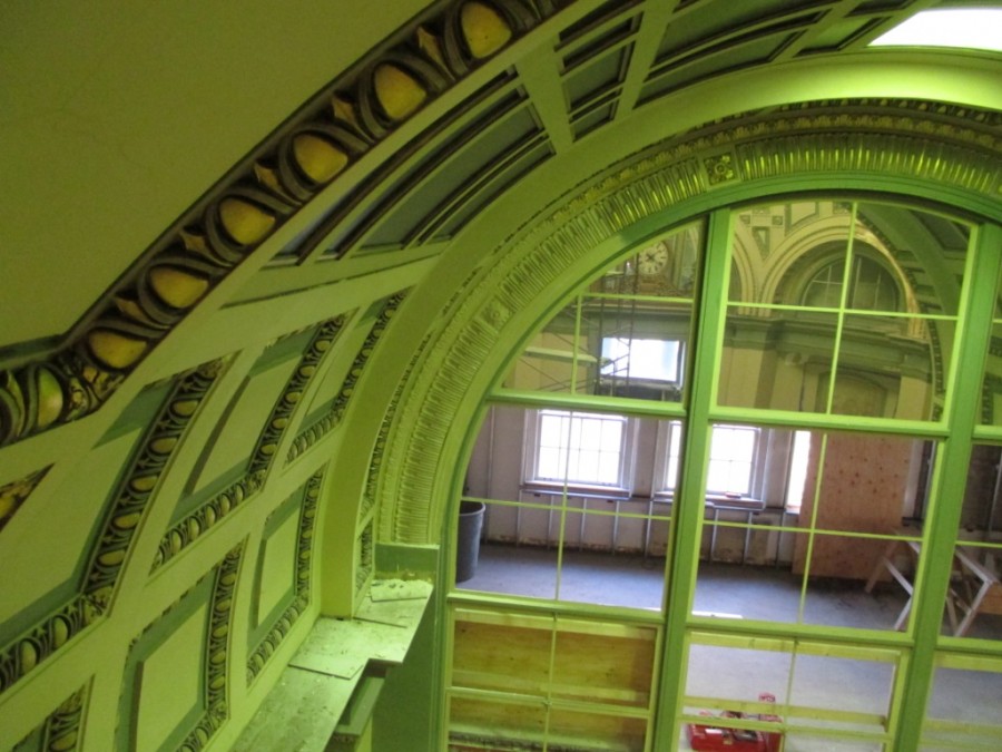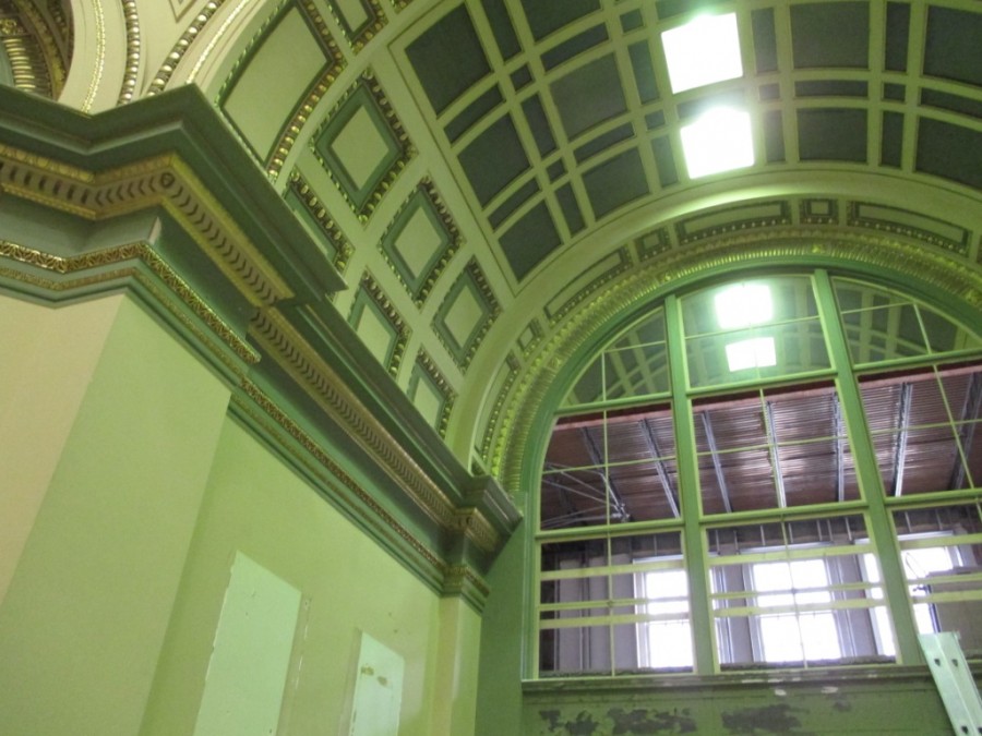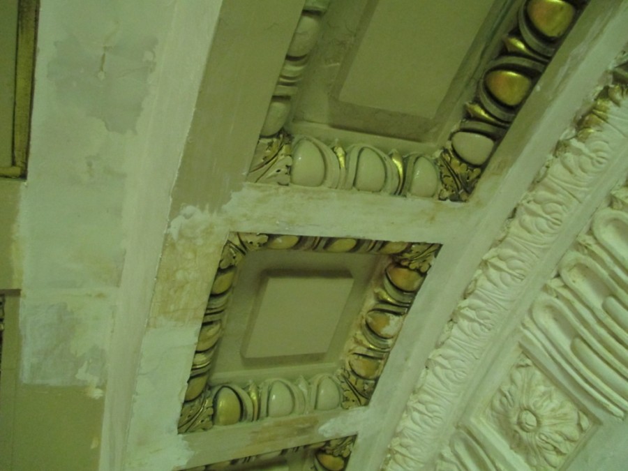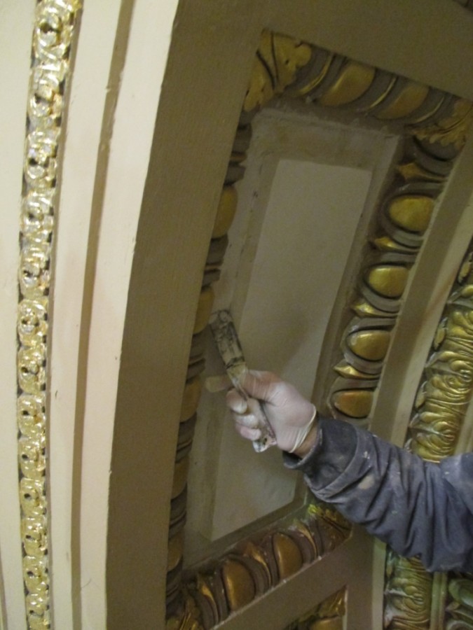 A series of chronic water leaks had damaged areas of the 50 foot interior plaster dome. Damage ranged from chipped and missing paint to entire sections, which had fallen to the ground. Other sections had eroded to the point of being unrecognizable. After first removing all failed paint, we next coated salvageable surfaces with a custom blended plaster consolidant. Once we had achieved a stable surface we applied a patching plaster/ plaster of Paris mix to re-form eroded areas. Missing or severely damaged were replaced by casting replacement sections from flexible rubber molds. After the plaster surfaces had been restored they were primed and painted to match surrounding colors.