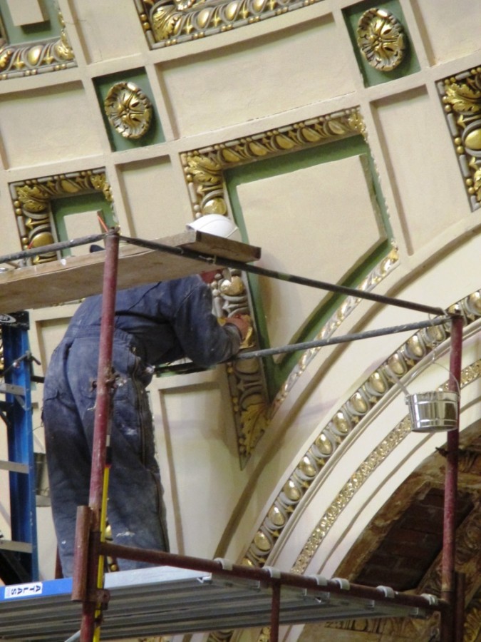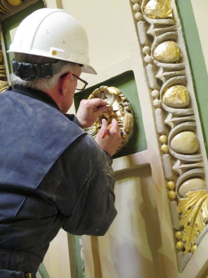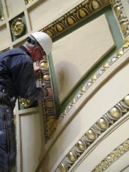 The gilt ornament and decorative paint on the doomed ceiling had been damaged as a result of a chronic roof leak. After repairing the plaster surface and restoring the decorative paint, Blackburn carefully resurfaced the damaged gilt surface, matched the color of the gold and applied the gold leaf where required.