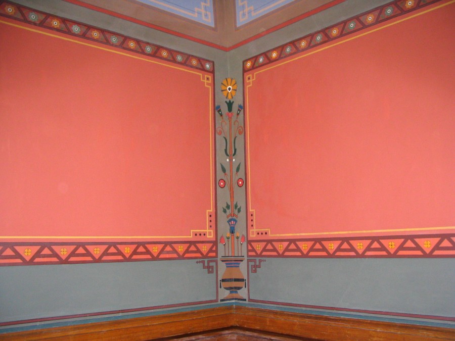 We chose a different approach. We removed and replaced the failed paint from the solid color fields, but cleaned conserved, and in-painted the areas of loss in the stenciled decorative bands with reversible pigments. This preserved the restored of the room while allowing the conservation the original decorative paint program. As seen in the above photo, the Billiards Room after conservation.