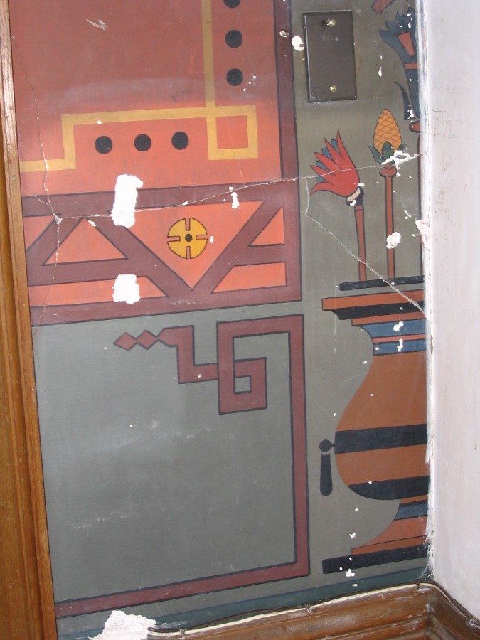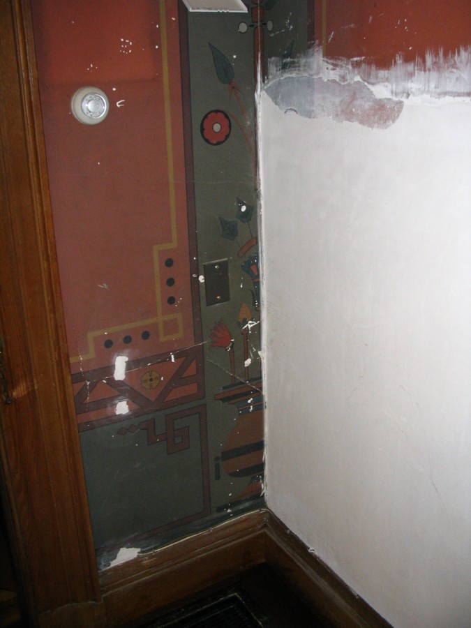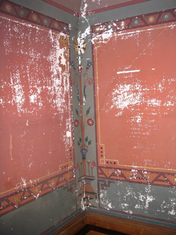 The elaborately stenciled Egyptian revival stencil programs applied throughout the house had all been restored and repainted except for the Billiards Room, located off the front hall stair landing. While the ceiling of the room had sustained little damage, the walls were extensively cracked and chipped due to plumbing issues, as well as, weather and temperature problems. In other parts of the house similar failures had led to the recording and replacement of the decorative paint program, following replacement of the plaster walls.