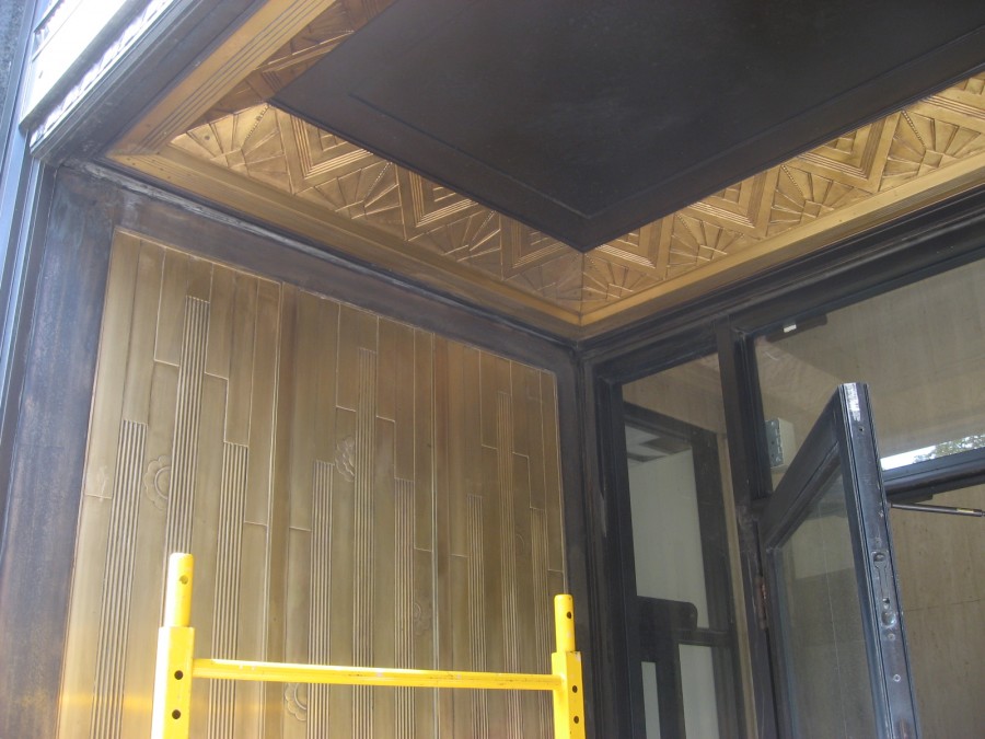 The Art Deco brass metal ornament on the exterior of the building, although previously coated to resist corrosion, had deteriorated over time resulting in greenish-black deposits on the lower portion of the entrance. The conservation process began with the removal of this oxidized coating followed by neutralization of the surface. Since the oxidized sections had disrupted the grained brass surface, we re-grained these areas with a fine abrasive. Following this we again neutralized the surface to remove any tarnish and applied a protective coating to the surface. This process was also repeated on the elevator cab doors, surrounds and cabs on the first floor. As a result of this work the original appearance of the ornamental metalwork was conserved and restored.