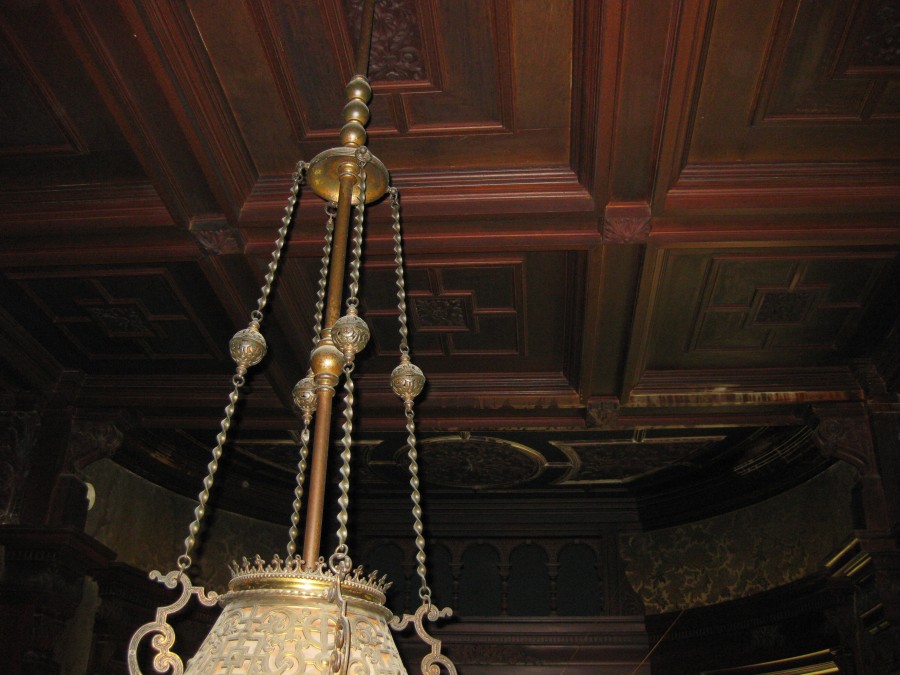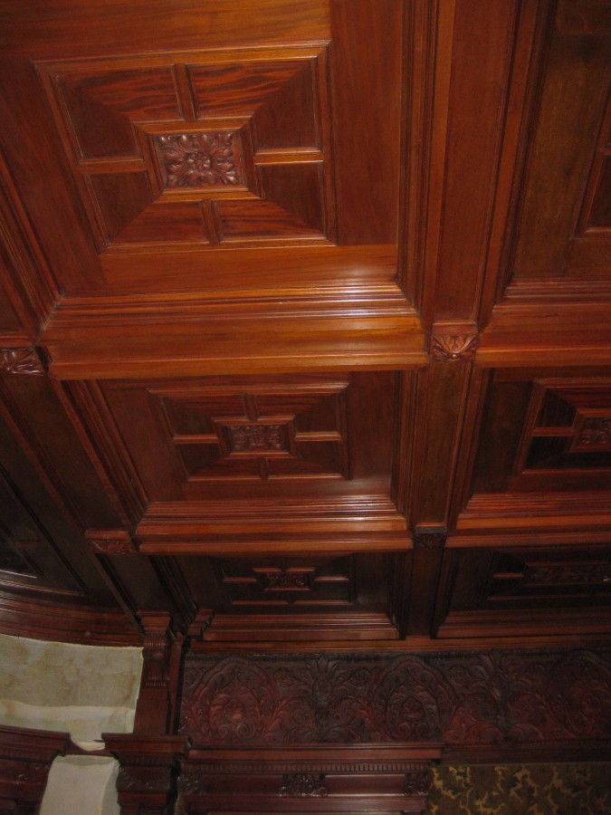 The conservation of the Wilderstein dining room wood paneling and plaster ornament involved removal of dust and soot, restoration of failed plaster ornament and repair of failed wood finishes on part of the ceiling due to a radiator failure. Since the original finish on much of the mahogany panels and ornament was sound, it required cleaning and conservation with a cotton ball moistened with very dilute non-ionic detergent. The plaster required consolidation with an acrylic liquid and in-painting with appropriate brown reversible paints to restore its original color. The ceiling required cleaning and removal of a heavy soot layer followed by application of shellac to moderate the water stain. Remaining cleaned areas were protected by the application of brown wax.